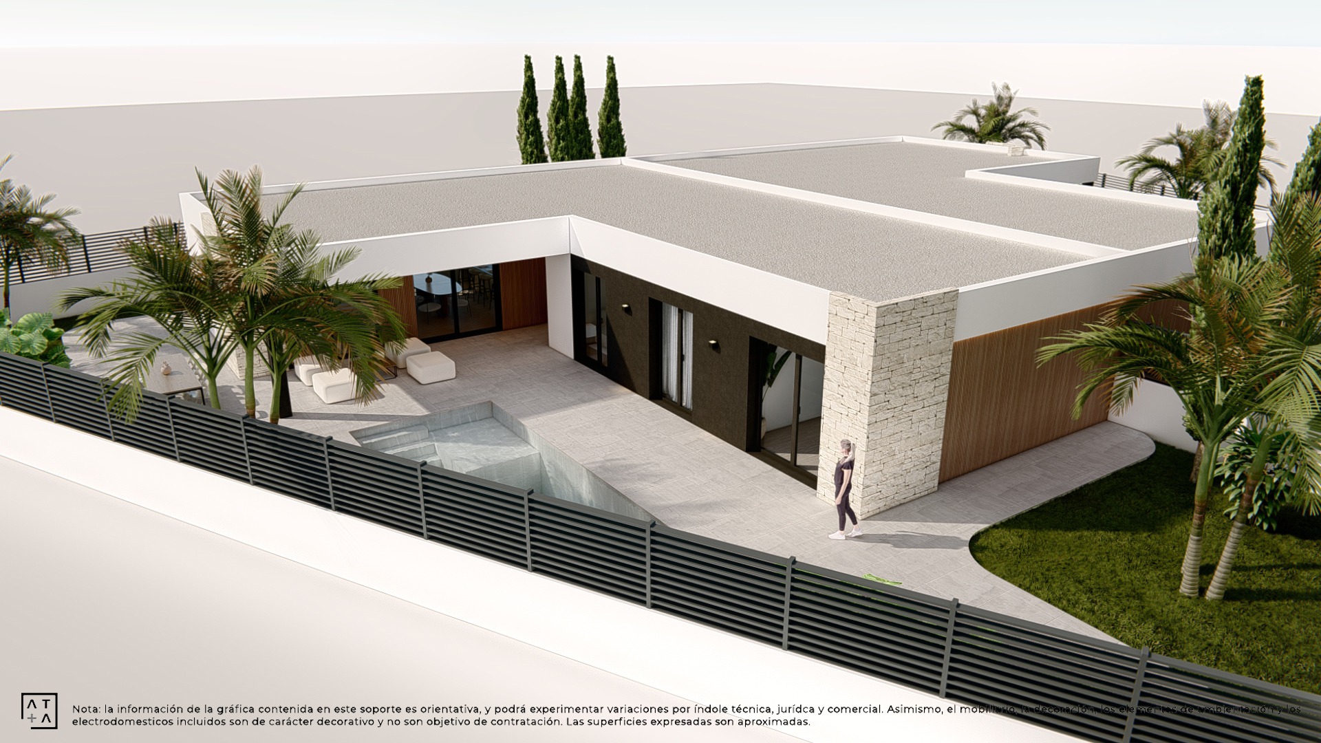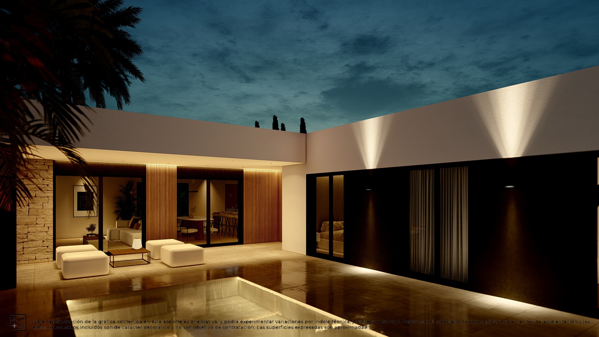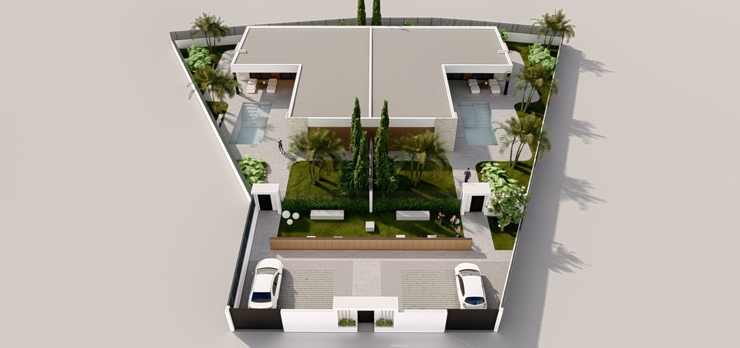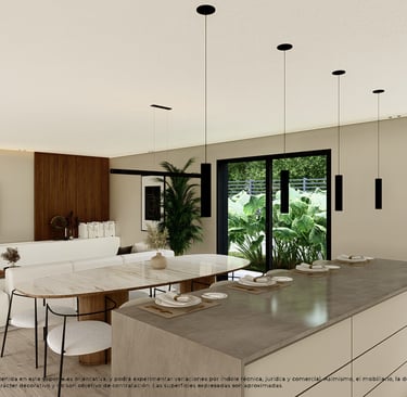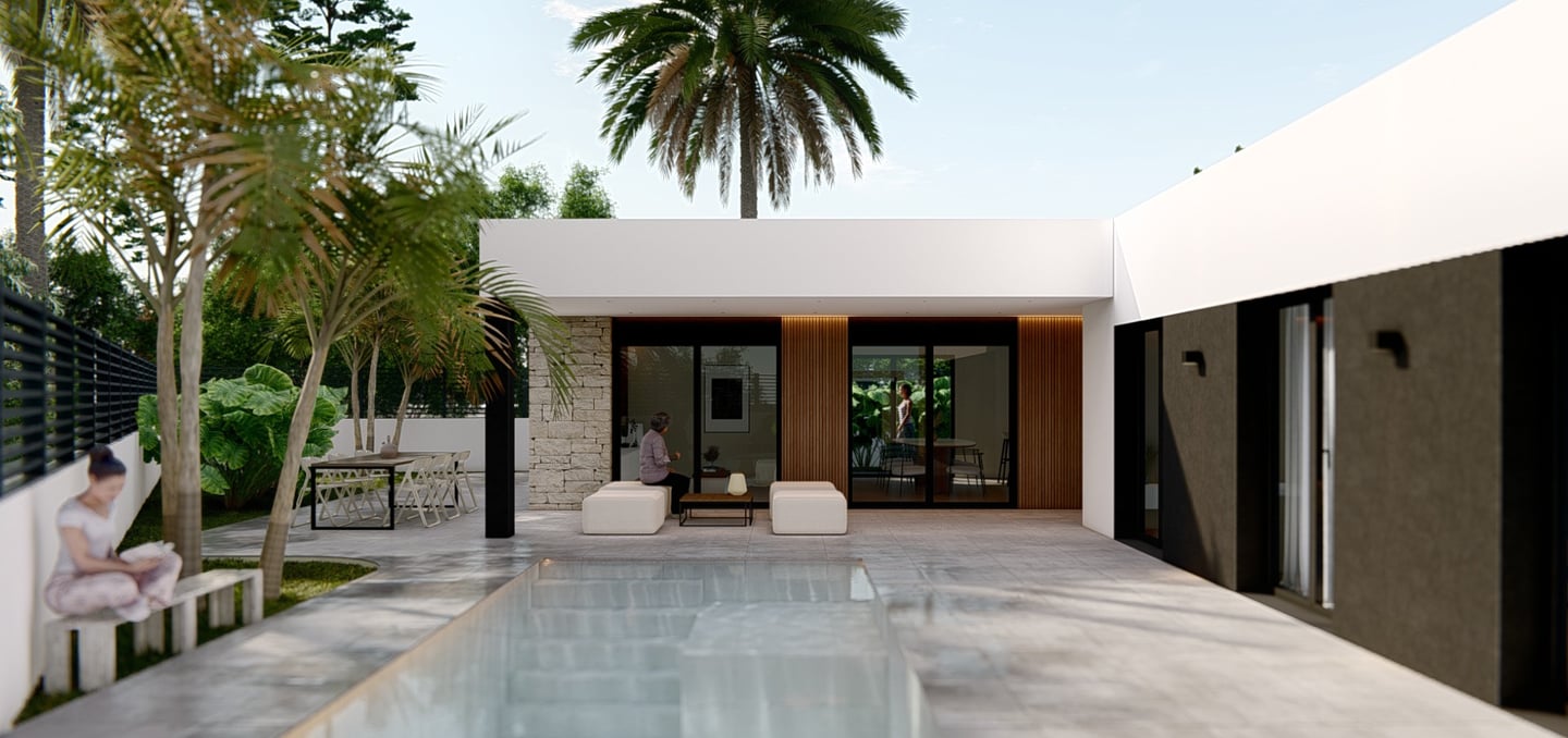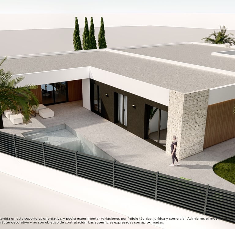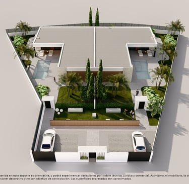 Cada vivienda cuenta con parcela privada, jardín y piscina individual, creando un espacio perfecto para el descanso y la vida al aire libre. El diseño exterior se integra de forma natural con el entorno, ofreciendo privacidad y bienestar.