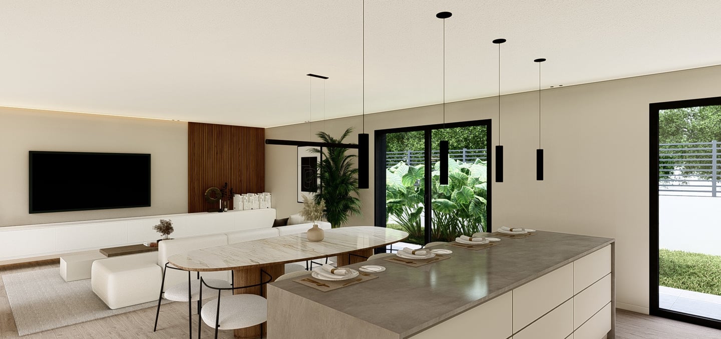 Vivienda de una sola planta con distribución funcional y equilibrada. La zona de día se organiza en un espacio abierto de salón-comedor-cocina con salida directa al exterior, conectando con la parcela privada y la piscina.