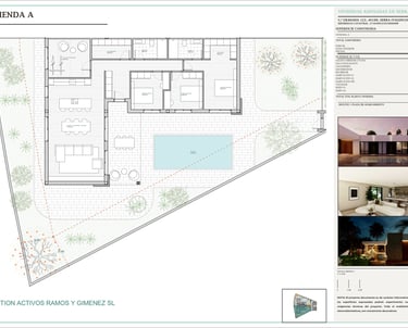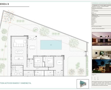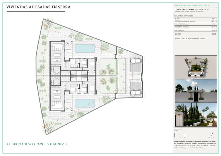 Plano general del conjunto residencial que muestra la implantación de las dos viviendas adosadas, los accesos, las parcelas privadas, las zonas ajardinadas y las piscinas, con una ordenación clara y equilibrada del espacio.
