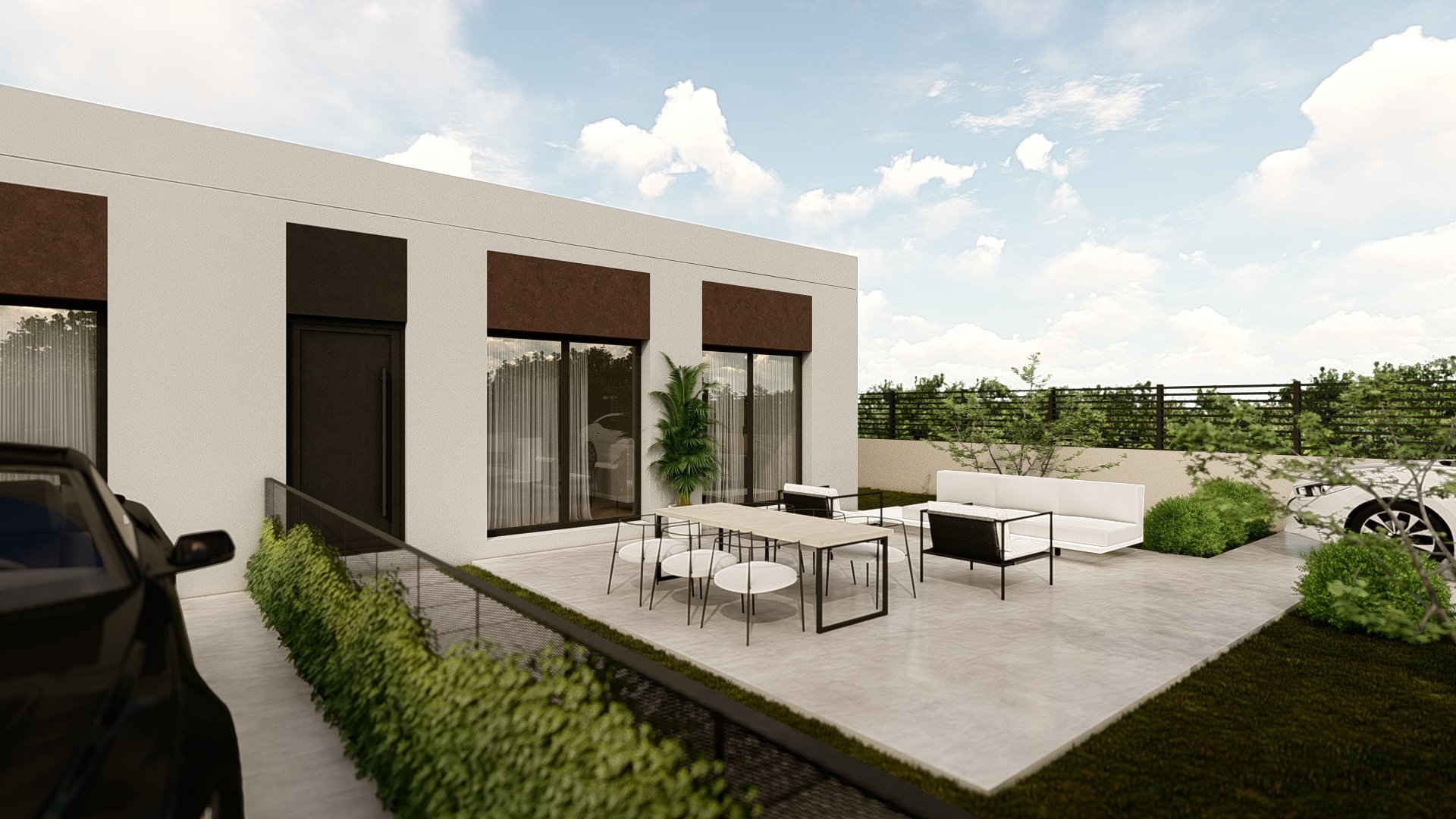 La fachada principal se destaca por su diseño moderno y elegante, con líneas rectas y un acabado en tonos blancos y marrones que armonizan con el entorno natural de la urbanización.
